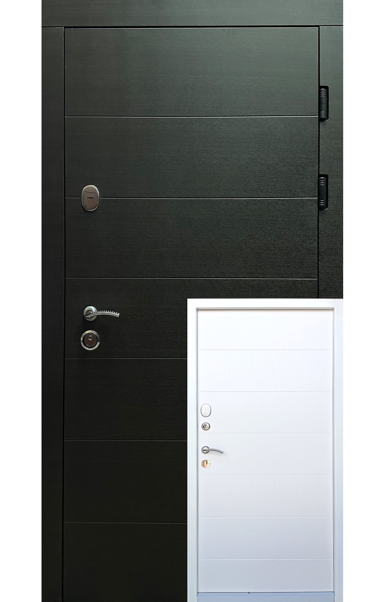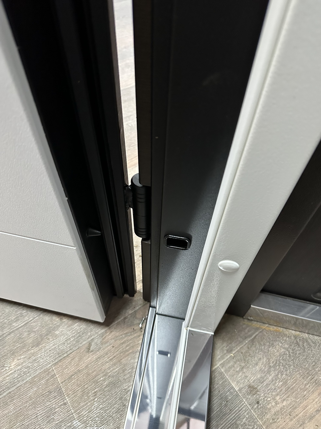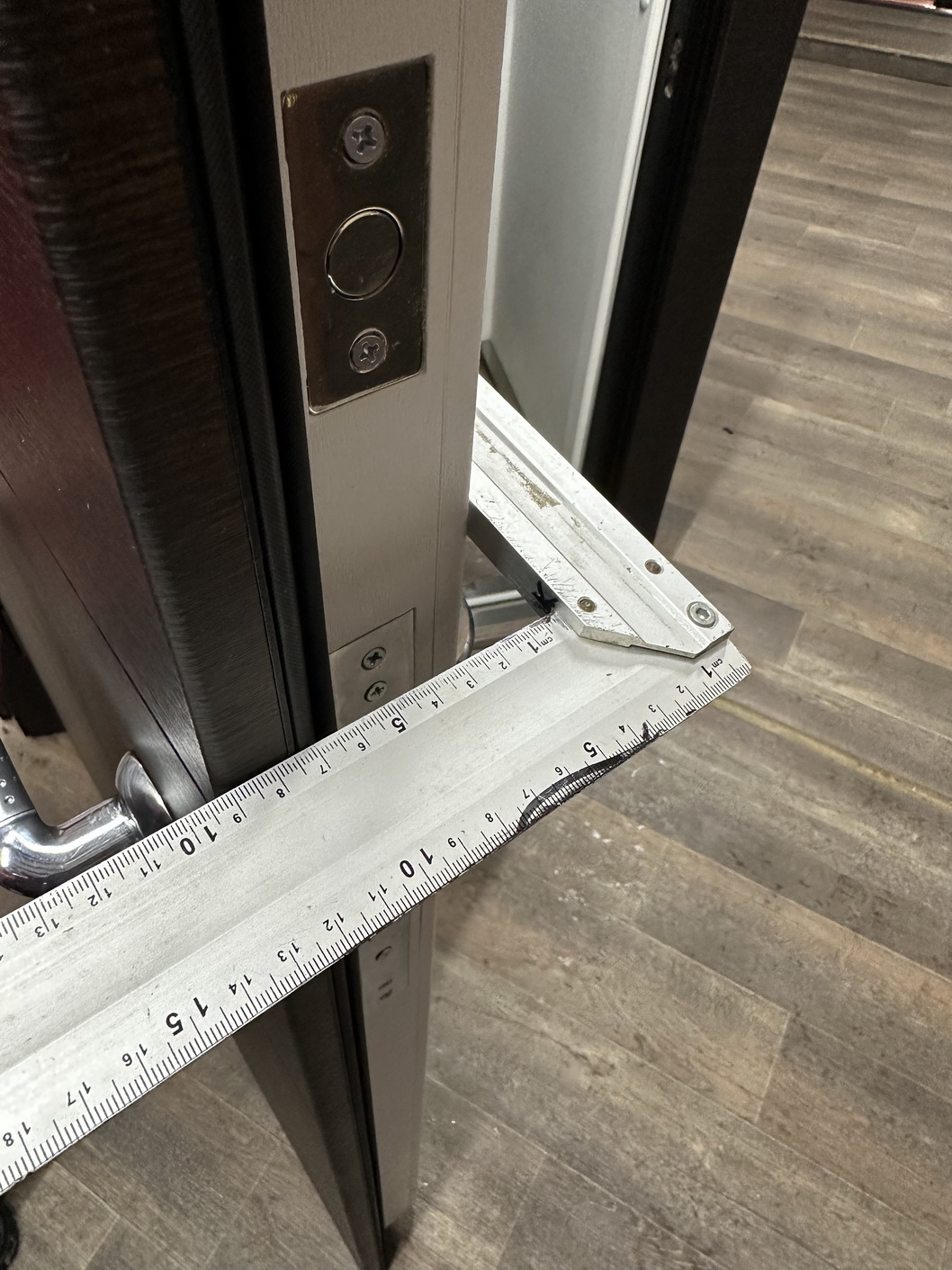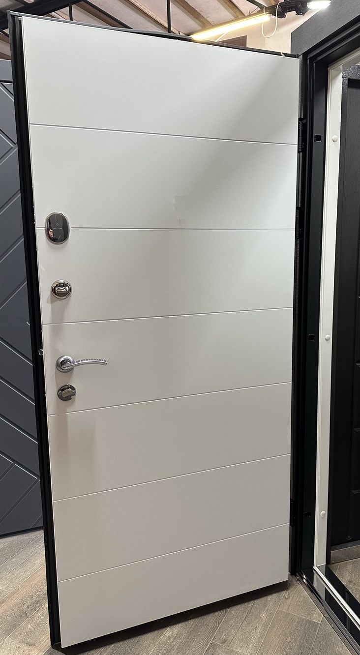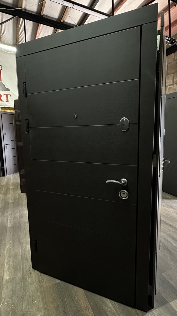 | Фурнітура | 3 петлі, ручка на розетті, нічний засув, ексцентрик, утоплена броненакладка, поріг з нерж. сталі, торець полотна зашитий МДФ, рама 2 кольори з терморозривом, БЕЗ ВІЧКА |