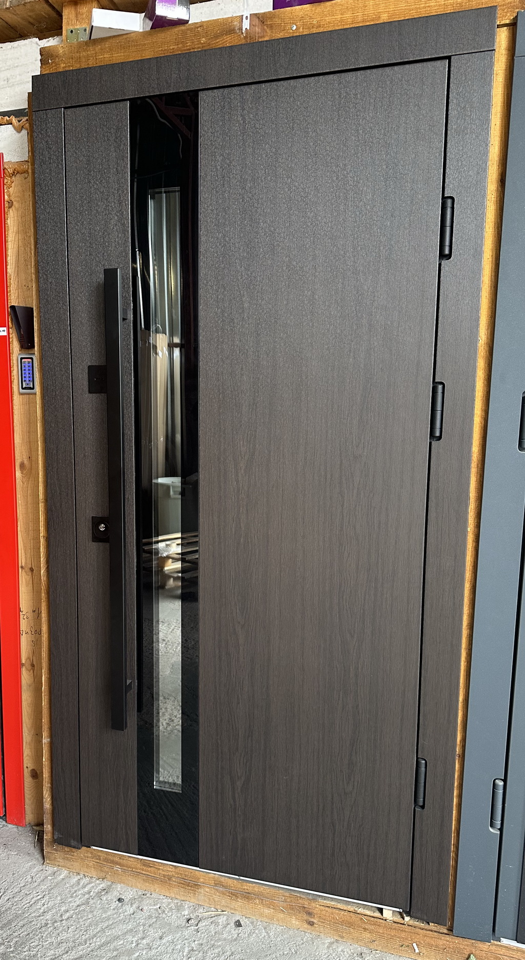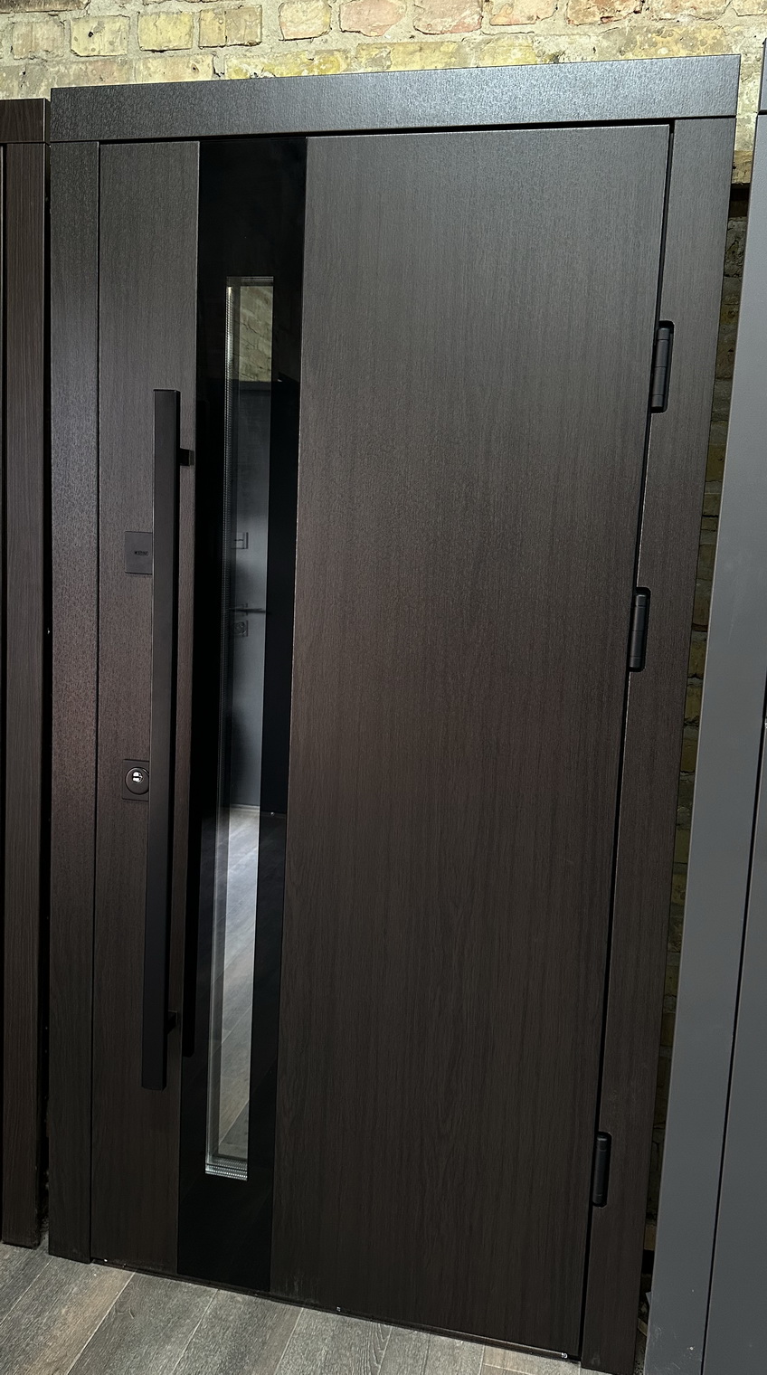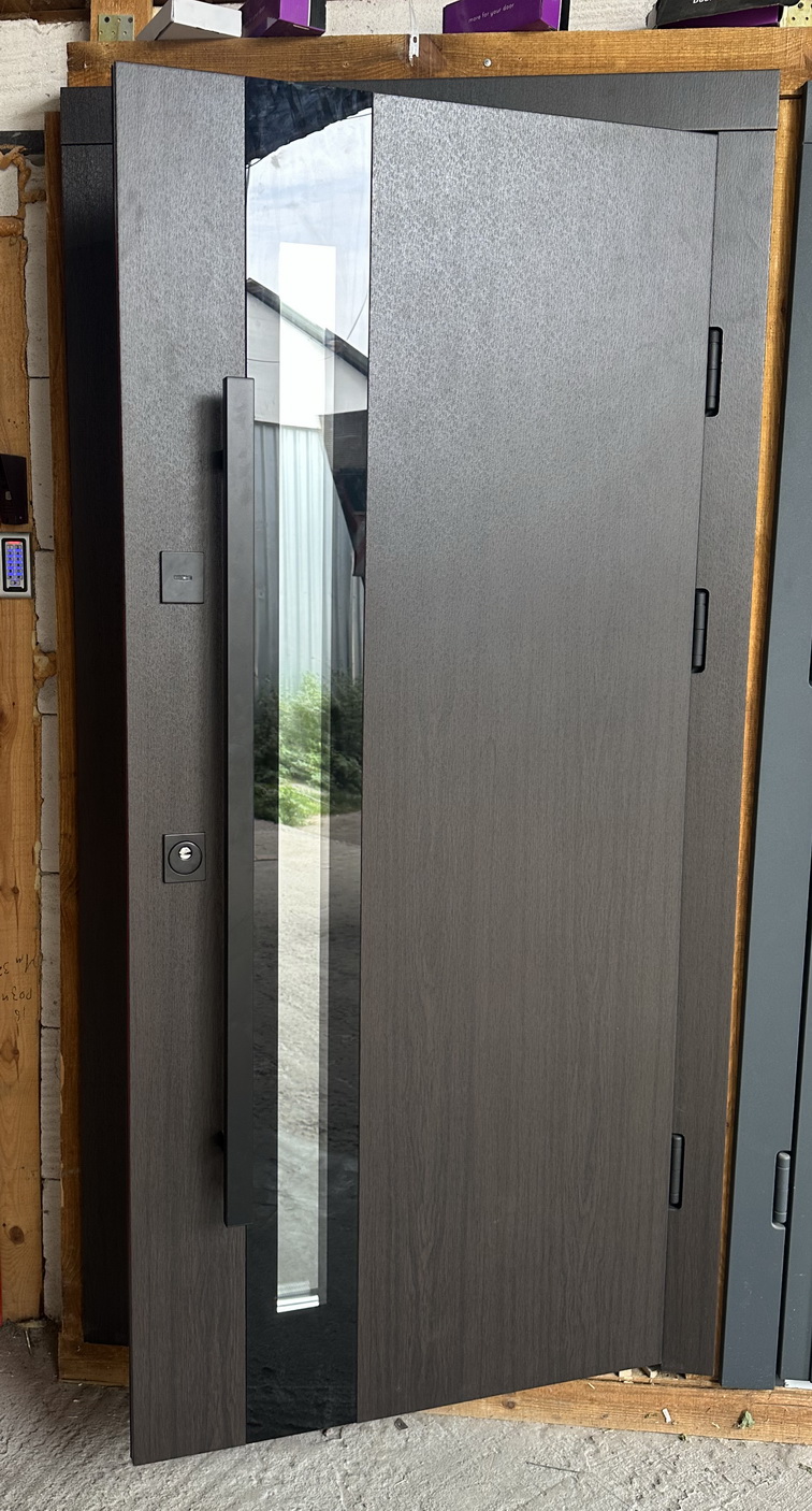 | Фурнітура | 3 зовнішні петлі, антизрізи, Чорна фурнітура, ручка труба чорна, утоплена броненакладка, терморозрив на рамі (пробка 4 мм), ексцентрик, поріг з нержавіючої сталі |