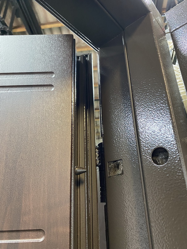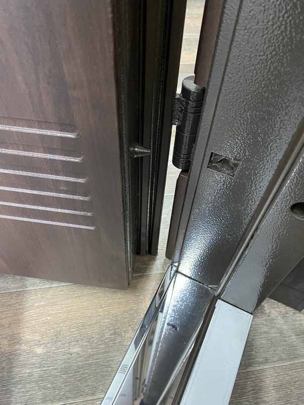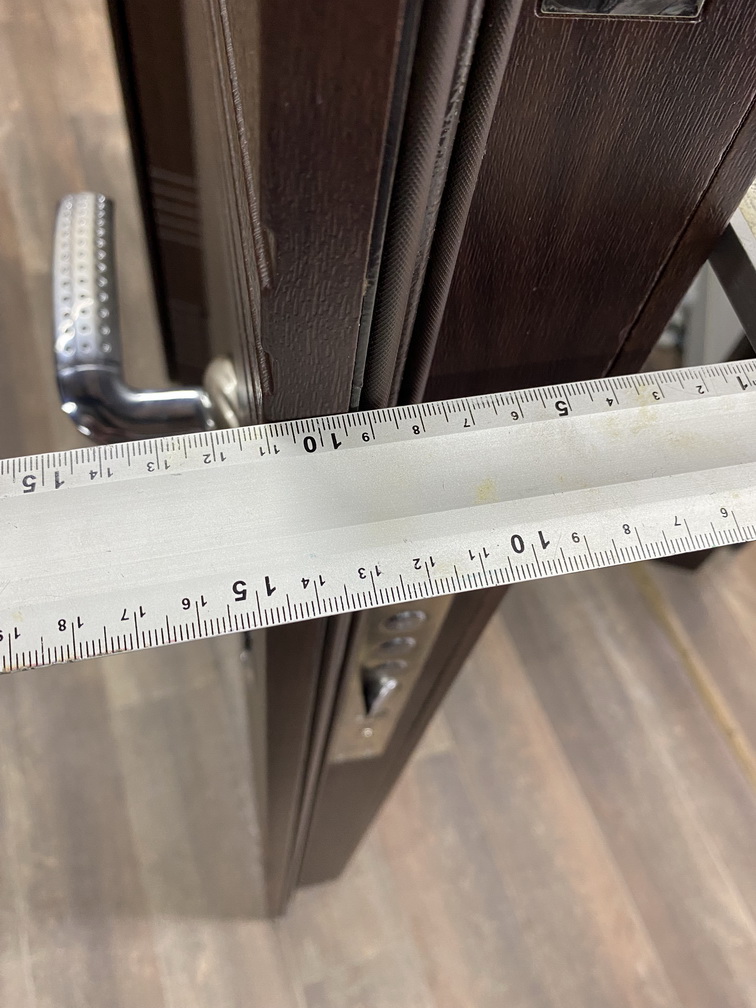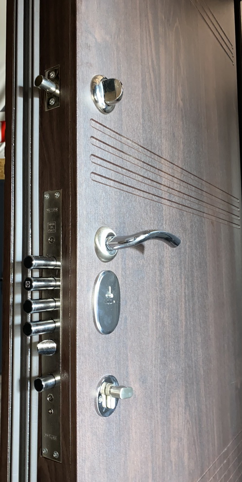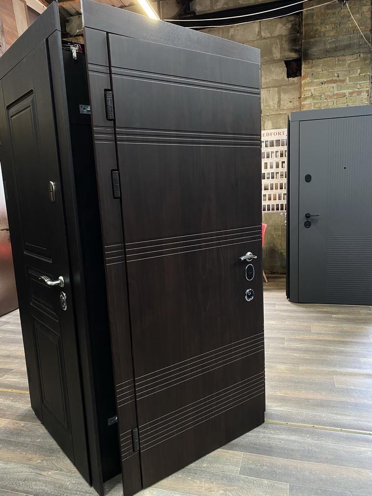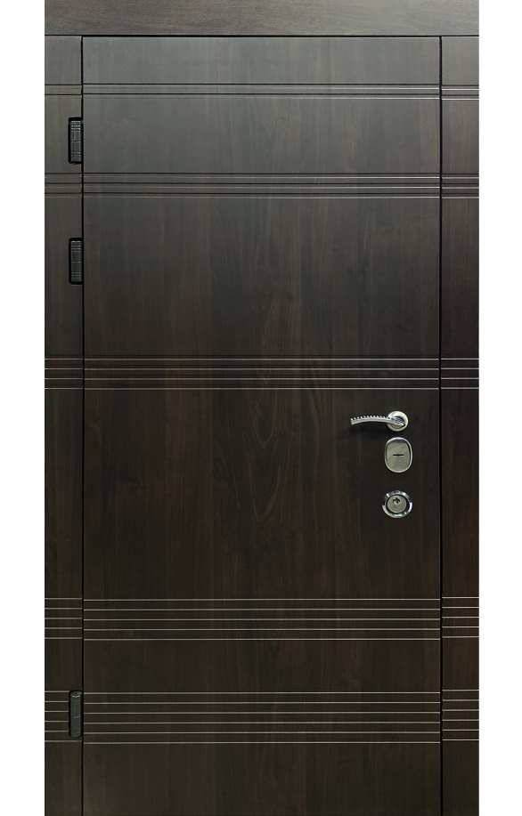 | Фурнітура | 3 петлі, ручка на розетті, нічний засув, ексцентрик, утоплена броненакладка, поріг з нерж. сталі, торець полотна зашитий МДФ |