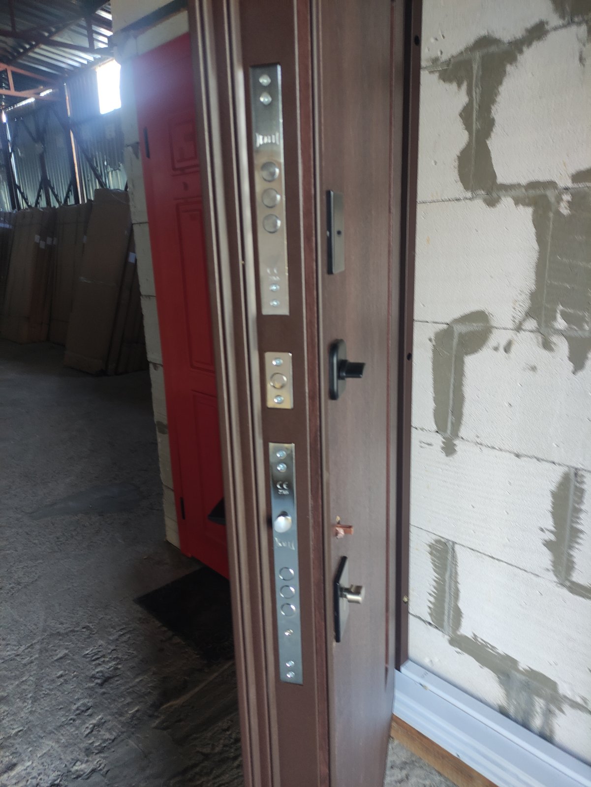 | Фурнітура | 3 петлі, ручка на розетті, ексцентрик, поріг з нержавіючої сталі, нічний засув. чорна фурнітура |