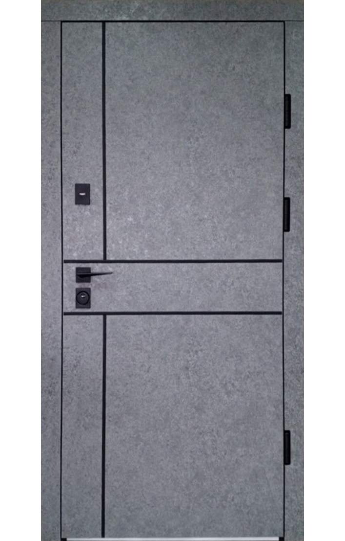 | Фурнітура | 3 зовнішні петлі, антизрізи, Чорна фурнітура, ручка на розетті, утоплена броненакладка, терморозрив на рамі (пробка 4 мм), ексцентрик, поріг з нержавіючої сталі |